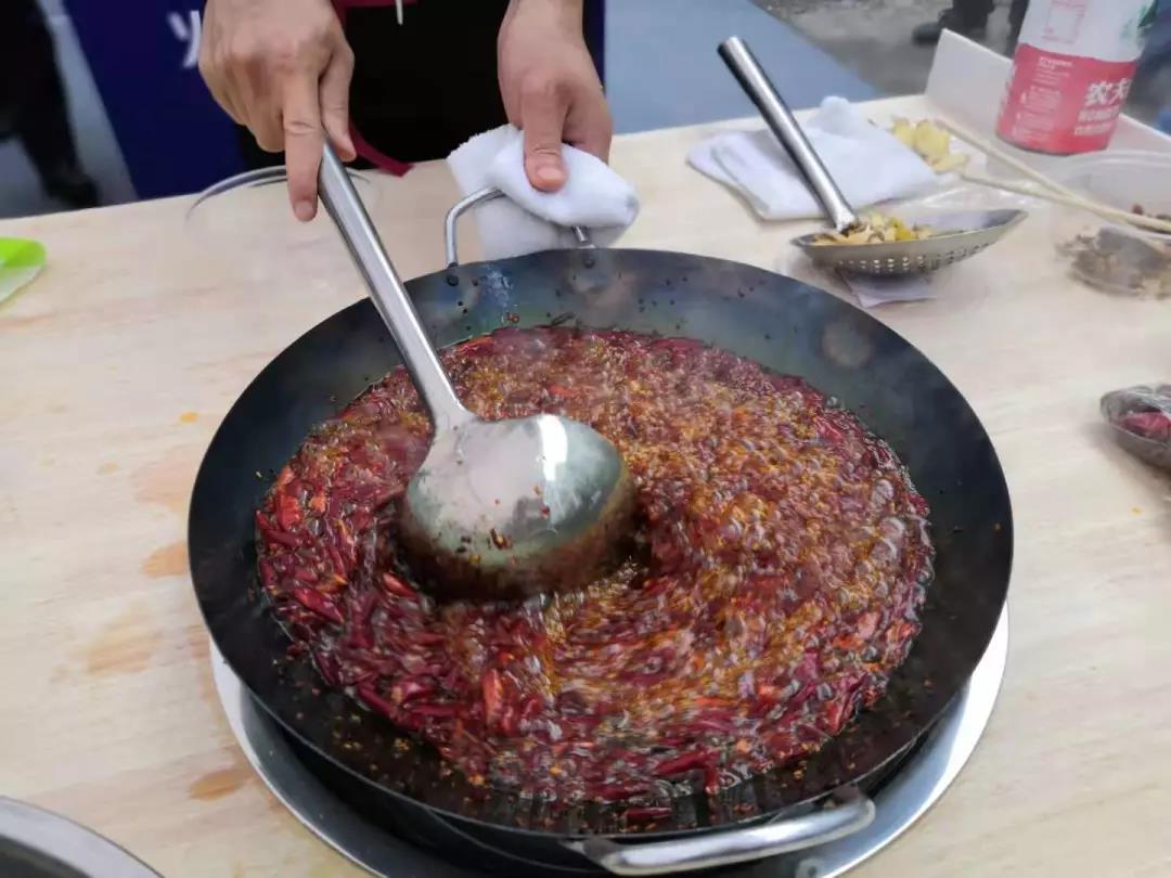 現(xiàn)場(chǎng)一溜的“高白帽”甚是搶眼,鍋里翻滾著的牛油香、色澤鮮亮的各味調(diào)料,引來(lái)不少市民駐足觀看。選手所使用的鍋具、調(diào)料均由主辦方提供,在70分鐘時(shí)間里,炒制出來(lái)的底料味道好壞與否,全憑著參賽選手豐富的手上功夫、對(duì)原材料分量及火候的把控。